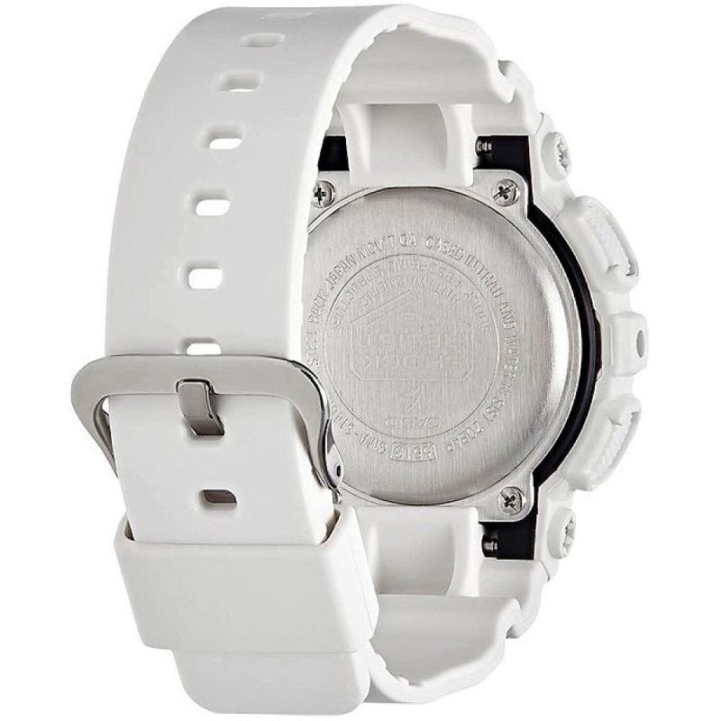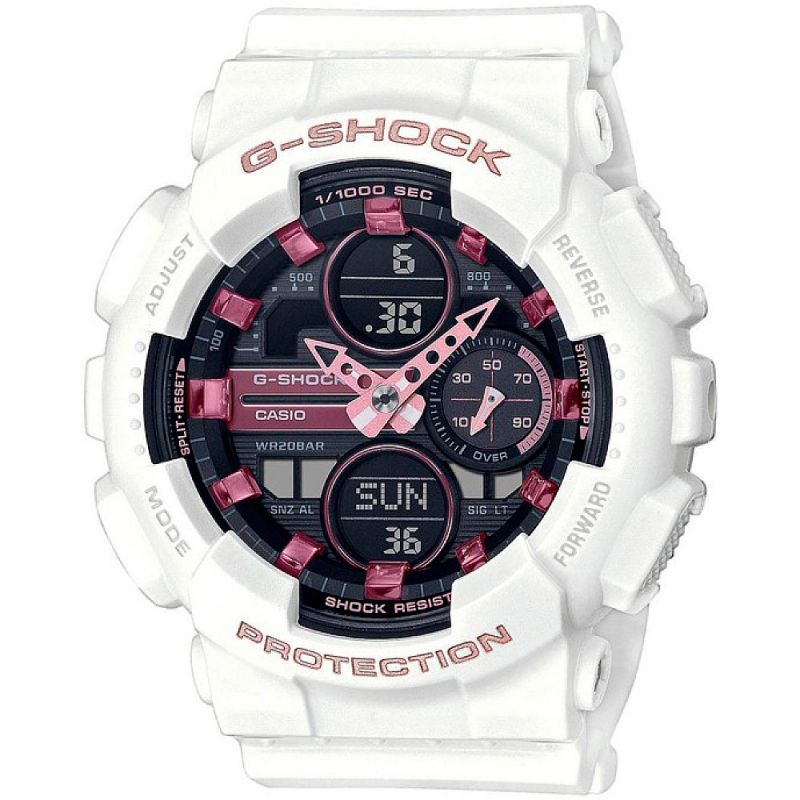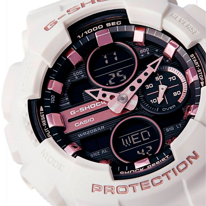 Спортен модел дамски часовник от серията G-SHOCK. Корпусът и каишката са изработени от полимерен материал. Дисплеят е комбинация от аналогов и дигитален. Стъклото е минерал-кристал, устойчиво на надраскване. Часовникът е със следните функции: световно време, автоматичен календар, хронометър, обратно броене, 12/24 часов формат, 5 независими дневни аларми (и 1 с snooze функция), сигнализация на кръгъл час on/off, двойно led осветяване на дисплея. Моделът е с подсилена конструкция, която защитава часовника от удари и вибрации. Задвижва се от кварцов механизъм с батерия CR1220. Водоустойчивост 20 ATM - позволява мокрене, къпане, плуване и гмуркане във водни басейни.