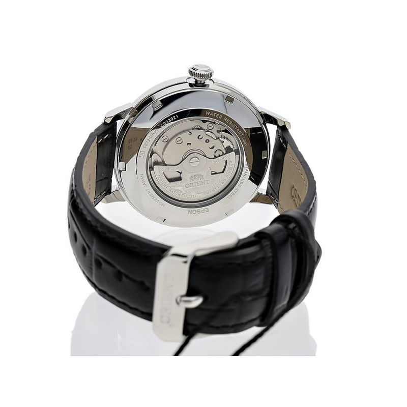 Стилен мъжки часовник Orient от колекция Contemporary. Корпус от неръждаема стомана. Кафява каишка от естествена кожа. Аналогов дисплей с показател за дата. Минерално стъкло, устойчиво на надраскване. Автоматичен механизъм Cal.F6722,който може да бъде наблюдаван през прозрачния гръб.. Водоустойчивост 5 ATM - допускат се леки пръски и взимане на душ, не се препоръчва обилно мокрене.