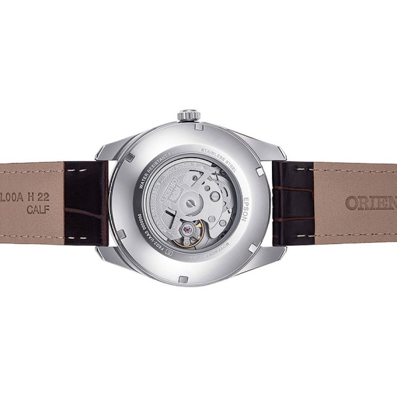 Мъжки часовник Orient Multi-year Calendar от колекция Contemporary с многогодишен календар и единствения по рода си дисплей, показващ година, месец, дата и ден. Моделът изразява креативния часовникарски стил на ORIENT, съчетавайки функционалността на механичните часовници с оригинален дизайн. Часовникът разполага с автоматична функционалност за ръчно навиване и механизъм Cal.F6D22. През прозрачния гръб на часовника, може да се наблюдава прецизното движение на механизма. Настройките на календара са значително подобрени в сравнение с предишните модели. Този модел наследява оригиналната система, която показва календара за повече от 20 години напред. Вече няма бутон за пръстена на дисплея, което означава, че всички настройки на функцията календар вече могат да бъдат изпълнени от короната. Корпусът е от неръждаема стомана и е съчетан с кафява кожена каишка. Дисплеят е в бял цвят. Водоустойчивост 5 ATM - допускат се леки пръски и взимане на душ, не се препоръчва обилно мокрене.