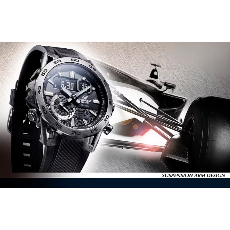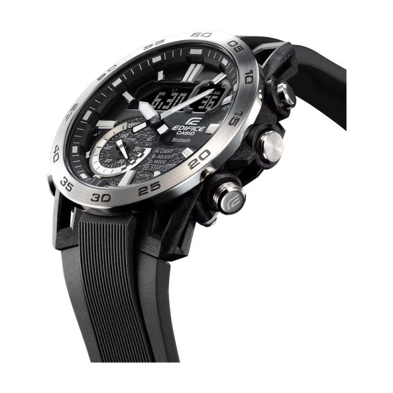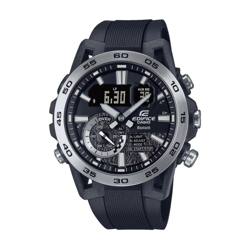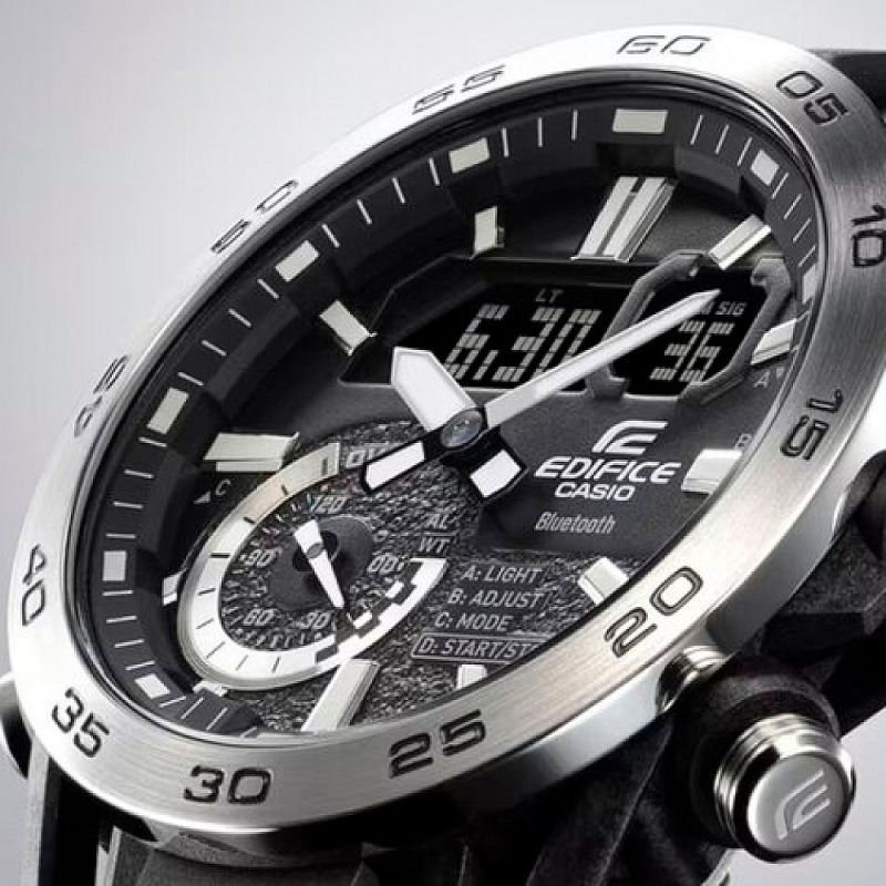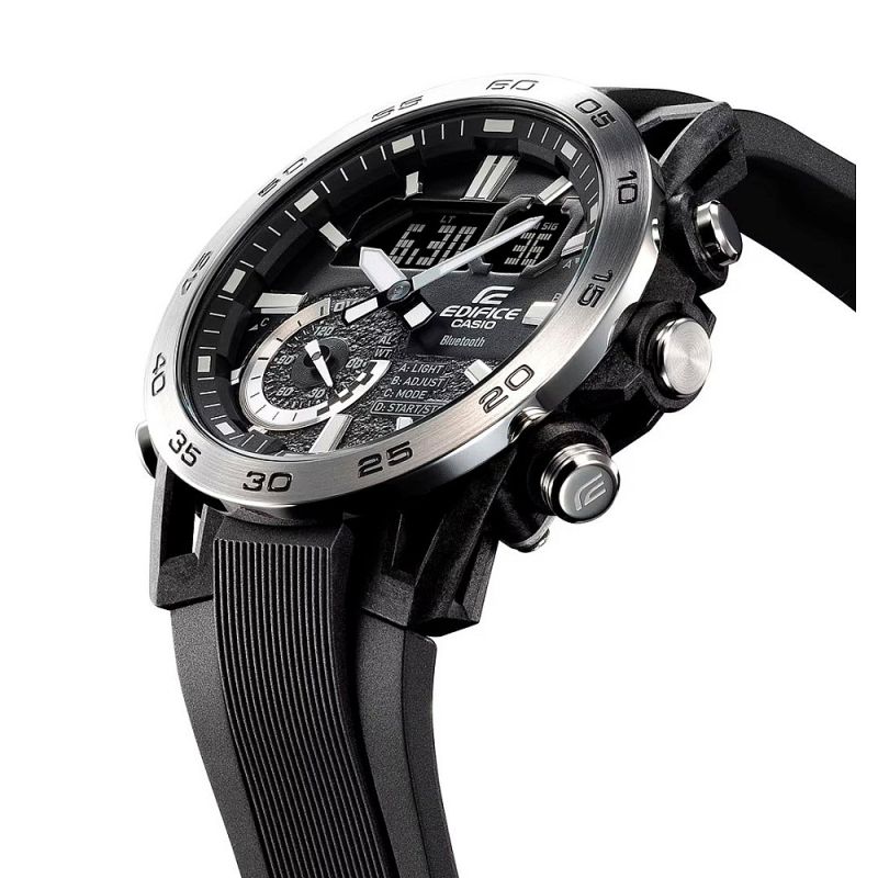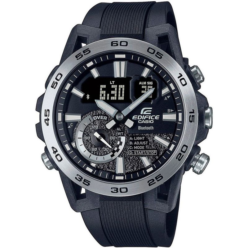 Мъжки часовник Casio с модерен спортно-елегантен дизайн от колекция Edifice. Моделът е с корпус от неръждаема стомана, съчетан с каишка от полимерен материал. Дисплеят е комбинация между аналогов и дигитален. Стъклото е минерал-кристал, устойчиво към надраскване. Часовникът е със следните функции: Bluetooth 4.0 връзка, съвместим с повечето смарт телефони - програма за свързване EDIFICE Connected или CASIO WATCHES, световно време,  5 дневни аларми (и 1 с snooze функция), обратно броене, хронометър, led осветяване на дисплея, показва дата от месеца и ден от седмицата, показва 24 часовия диапазон, phone finder. Кварцов механизъм с батерия CR2016. Водоустойчивост 10 ATM - позволява мокрене, къпане и плуване във водни басейни.