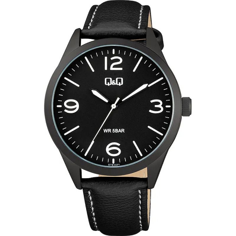 Мъжки часовник Q&Q Q77B-002PY с Кожена каишка/верижка и Кварцов механизъм