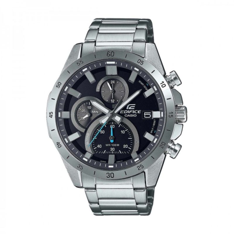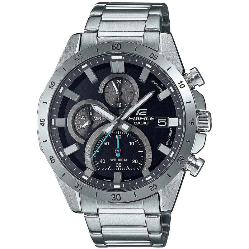 Мъжки часовник Casio с корпус и верижка от неръждаема стомана. Стъкло минерал-кристал. Черен дисплей хронограф с тюркоазени детайли. Кварцов механизъм. Водоустойчивост 10 ATM - позволява мокрене, къпане и плуване във водни басейни.