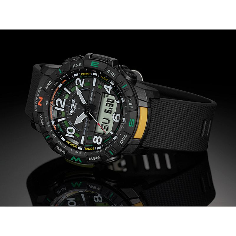 Мъжки часовник Casio от колекция PRO TREK с корпус и каишка от полимер. Стъкло минерал-кристал. Моделът е със следните функции: Bluetooth 4.0 връзка, съвместим с повечето смарт телефони (програма за свързване PRO TREK Connected), phone finder, изгрев/залез, дигитален компас, алтиметър , барометър, термометър, световно време, автоматичен календар, хронометър, обратно броене, 12/24 часов формат, 5 независими дневни аларми, led осветяване на дисплея. Водоустойчивост 10 ATM - позволява мокрене, къпане и плуване във водни басейни.