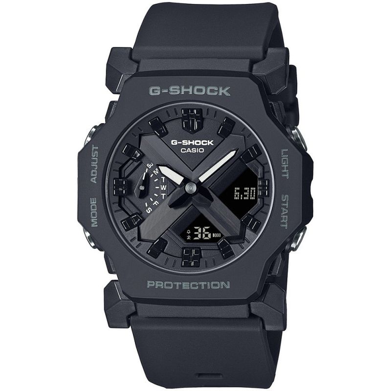 Мъжки часовник Casio с модерен дизайн от колецията G-Shock. Корпус и каишка изработени от полимерен материал . Стъклото е минерал-кристал, устойчиво към надраскване. Дисплеят е комбинация от аналогов и дигитален в черен цвят. Часовникът е със следните характеристики: удароустойчивост, световно време, автоматичен календар, хронометър, обратно броене, 12/24 часов формат, 5 независими дневни аларми, led осветяване на дисплея. Задвижва се от кварцов механизъм с 2 батерии SR726W. Водоустойчивост 20 ATM - позволява мокрене, къпане, плуване и гмуркане във водни басейни.