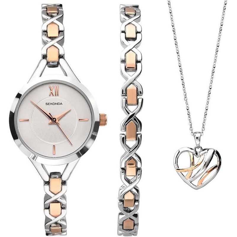 Комплектът включва: 1 бр. дамски часовник Sekonda, 1 бр. дамска гривна и 1 бр. дамско колие