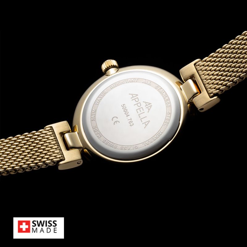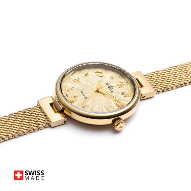Стилен дамски часовник Appella L50004.1171DQ с нежен дизайн. Циферблат в златист цвят, украсен със 6 диаманта. Корпусът и тънка верижка изработени от неръждаема стомана. Стъкло минерал-кристал. Задвижва се от кварцов механизъм RONDA 763 Swiss Made. Диаметър на корпуса 30 мм. Водоустойчивост 3 ATM - допускат се леки пръски, не се препоръчва обилно мокрене.