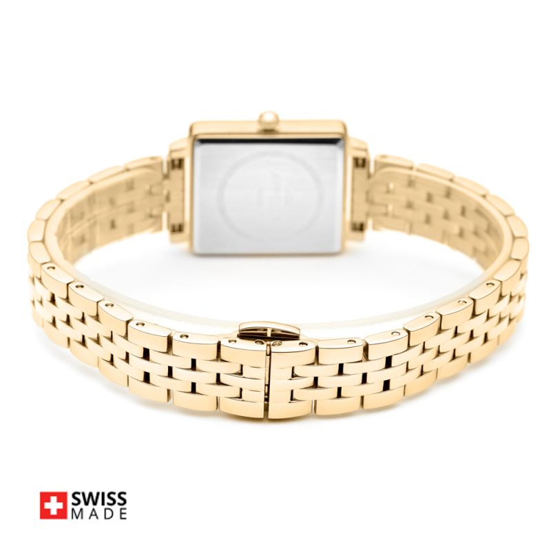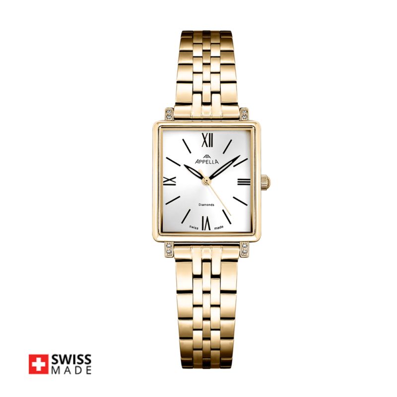 Дамски часовник Appella L50023.1163DQ привлича вниманието със своята елегантност. Корпус и верижка в златист цвят, изработени от неръждаема стомана. Корпусът е украсен с осем диаманта. Моделът е със сребрист циферблат и стъкло сапфир-кристал с антирефлетсно покритие. Задвижва се от кварцов механизъм ETA F04/ RONDA 785 Swiss Made. Водоустойчивост 3 ATM - допускат се леки пръски, не се препоръчва обилно мокрене.