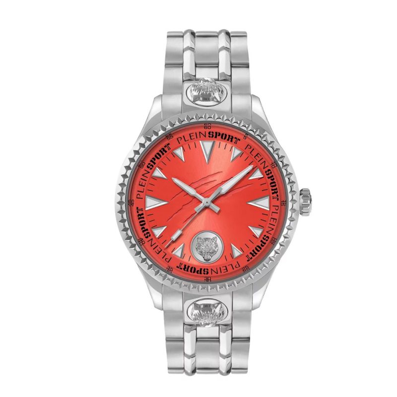 Спортно-елегантен мъжки часовник Philipp Plein. Моделът е с корпус и верижка от неръждаема стомана. Диаметър на корпуса 45 мм. Съкло минерал-кристал. Аналогов дисплей в оранжев цвят със сребристи детайли, драскотини и емблематичното лого на колекцията Plein Sport. Луминесцентно покритие върху стрелките и индексите. Часовникът се задвижва от кварцов механизъм. Водоустойчивост 5 ATM - допускат се леки пръски и взимане на душ, не се препоръчва обилно мокрене.