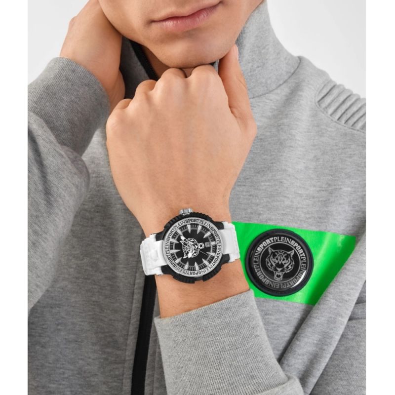 Унисекс часовник Philipp Plein с модерна спортна визия. Корпус изработен от неръждаема стомана. Диаметър на корпуса 45 мм. Бяла силиконова каишка. Моделът е с черен циферблат с характерното лого на колекцията Plein Sport и с показател за дата. Минерално стъкло, устойчиво към надраскване. Часовникът се задвижва от кварцов механизъм. Водоустойчивост 5 ATM - допускат се леки пръски и взимане на душ, не се препоръчва обилно мокрене.