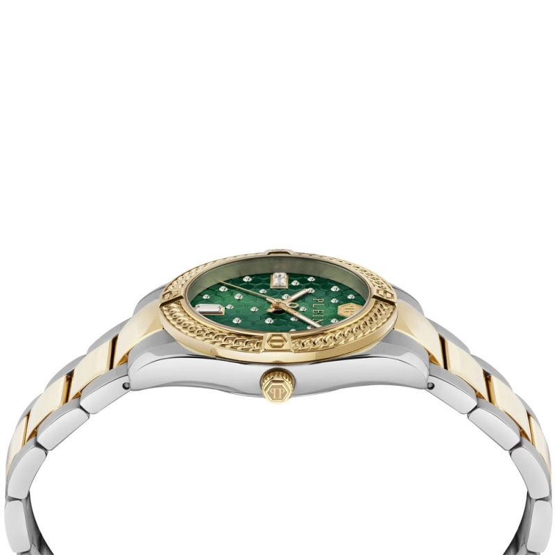 Дамски часовник Philipp Plein с нежна визия. Моделът е с корпус и верижка от неръждаема стомана и интересен дизайн тип плетка върху безела. Стъклото е минерал-кристал. Дисплеят е аналогов в зелен цвят със златисти акценти и декорация от кристали. Часовникът се задвижва от кварцов механизъм. Диаметър на корпуса 36 мм. Водоустойчивост 5 ATM - допускат се леки пръски и взимане на душ, не се препоръчва обилно мокрене.