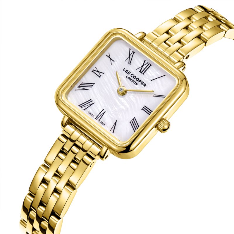Класически модел дамски часовник Lee Cooper с изискана визия. Корпус изработен от супер метал. Верижка от неръждаема стомана. Аналогов дисплей в красив седефен цвят със златисти стрелки и черни римски цифри. Стъкло минерал-кристал. Задвижва се от кварцов механизъм. Водоустойчивост 3 ATM - допускат се леки пръски, не се препоръчва обилно мокрене.