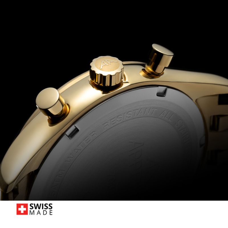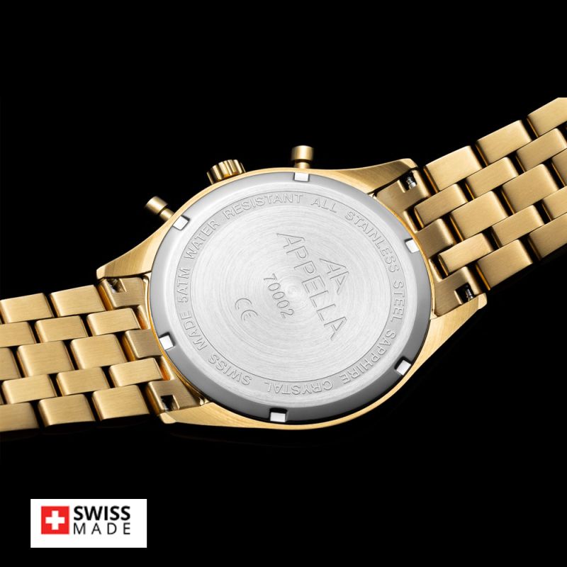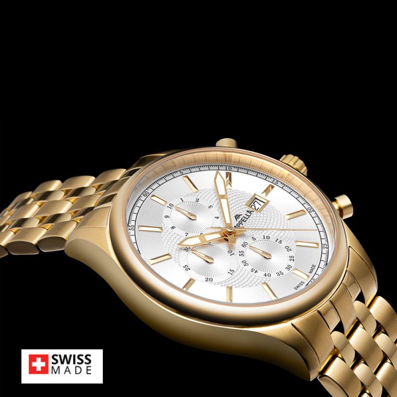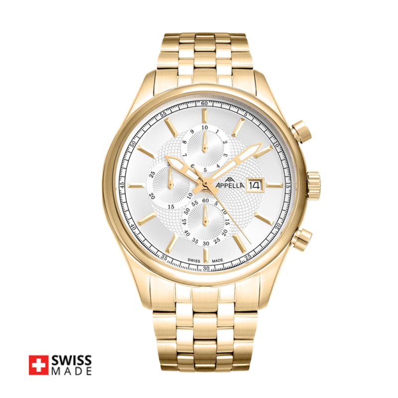 Стилен мъжки часовник Appella L70002.1113CH с корпус и верижка от неръждаема стомана. Сребрист дисплeй хронограф със златисти детайли. Стъкло сапфир-кристал. Задвижва се от кварцов механизъм RONDA 3540D Swiss Made. Диаметър на корпуса 43 мм. Водоустойчивост 5 ATM - допускат се леки пръски и взимане на душ, не се препоръчва обилно мокрене.