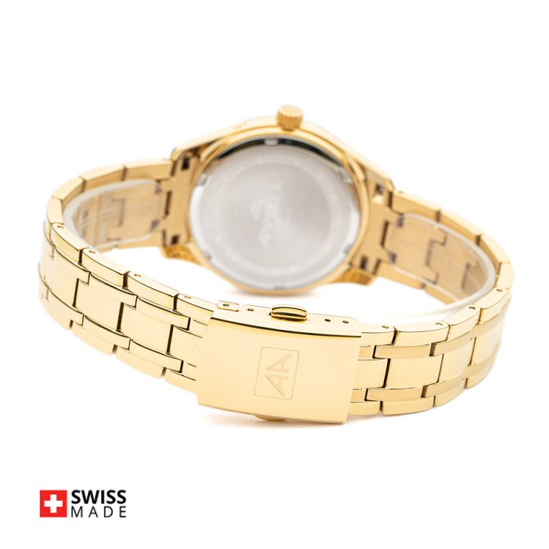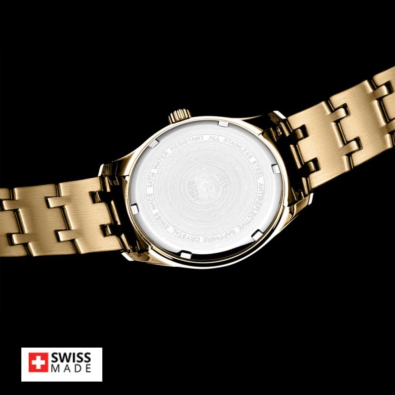Appella L50021.1163DQF е дамски часовник, който се отличава с елегантен златист корпус и сребрист циферблат, украсен с три диаманта. Стъклото е сапфир-кристал с антирефлексно покритие. Корпусът и верижката са изработени от неръждаема стомана. Верижката е декорирана с нежни кристали. Мултифункционалният дисплей е с показатели за дата, ден от седмицата и лунна фаза. Задвижва се от кварцов механизъм RONDA 706 Swiss Made. Диаметър на корпуса 36 мм. Водоустойчивост 3 ATM - допускат се леки пръски, не се препоръчва обилно мокрене.