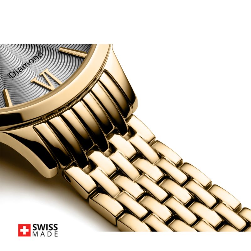 Елегантен дамски часовник Appella L50012.1167DQ, който впечатлява с фин сив циферблат, украсен с диамант, контрастиращ със златистия корпус. Моделът е с показател за дата и сапфирено стъкло. Корпус и верижка изработени от неръждаема стомана. Часовникът се задвижва от кварцов механизъм RONDA 785 Swiss Made. Диаметър на корпуса 30 мм. Водоустойчивост 3 ATM - допускат се леки пръски, не се препоръчва обилно мокрене.
