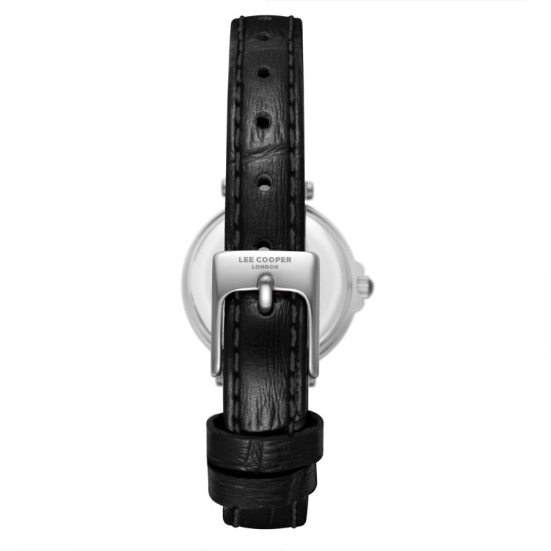 Дамски часовник Lee Cooper с класически дизайн.Корпус изработен от супер метал. Каишка от естествена кожа в черен цвят. Диаметър на корпуса 24 мм. Аналогов дисплей в бял цвят със сини стрелки и черни римски цифри. Стъкло минерал-кристал. Задвижва се от кварцов механизъм. Водоустойчивост 3 ATM - допускат се леки пръски, не се препоръчва обилно мокрене.