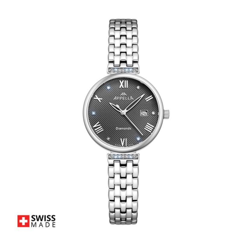 Дамски часовник Appella L50006.5187DQ с елегантна визия. Тъмносив циферблат, декориран със шест нежни диаманта и допълнен с индикатор за дата. Корпус от неръждаема стомана. Сребриста стоманена верижка украсена с кристали. Стъкло сапфир-кристал. Задвижва се от кварцов механизъм ETA F04 Swiss Made. Диаметър на корпуса 30 мм. Водоустойчивост 3 ATM - допускат се леки пръски, не се препоръчва обилно мокрене.