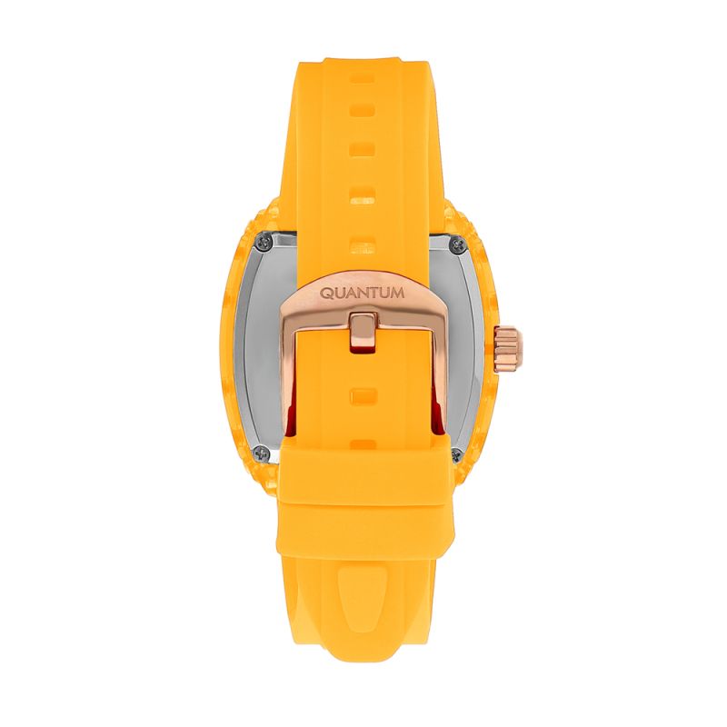 Дамски часовник Quantum с модерна спортна визия в жълт цвят. Мултифункционален дисплей с показатели за дата, ден от седмицата и 24-часов формат. Стъкло минерал-кристал. Моделът е с корпус от полимер и силиконова каишка. Часовникът се задвижва от кварцов механизъм. Водоустойчивост 5 ATM - допускат се леки пръски и взимане на душ, не се препоръчва обилно мокрене.