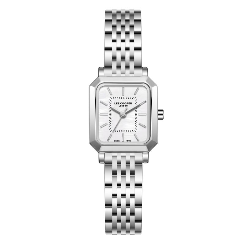 Дамски часовник Lee Cooper с класическа визия от колекцията Elegance. Корпус от супер метал в комбинация с верижка от неръждаема стомана. Аналогов дисплей в нежен седефен цвят със сребристи стрелки и индекси. Стъкло минерал-кристал. Задвижва се от кварцов механизъм. Водоустойчивост 3 ATM - допускат се леки пръски, не се препоръчва обилно мокрене.