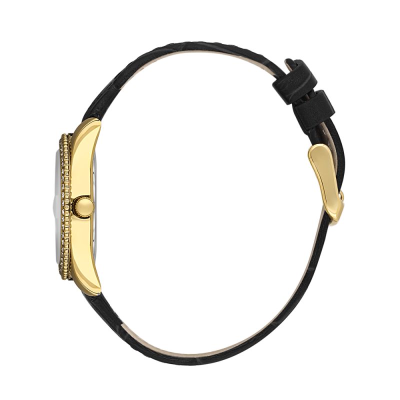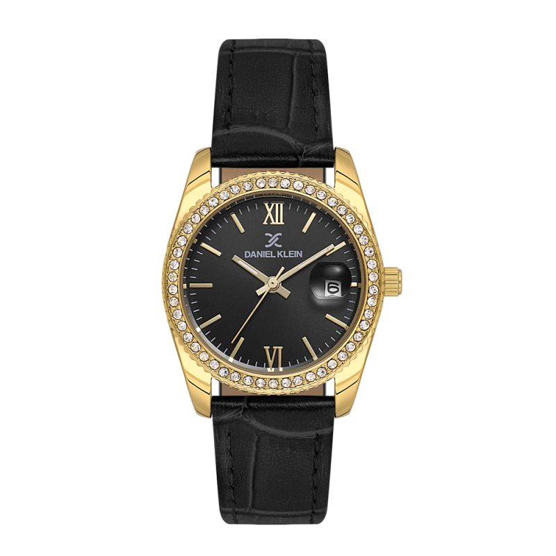 Стилен дамски часовник Daniel Klein с красив дизайн от колекцията Premium. Аналогов дисплей в черен цвят с показател за дата. Декорация от нежни кристали по безела. Метален корпус. Диаметър на корпуса 37.5 мм. Черна каишка от естествена кожа. Стъкло минерал-кристал. Задвижва се от кварцов механизъм VX12E11. Водоустойчивост 3 ATM - допускат се леки пръски, не се препоръчва обилно мокрене.
