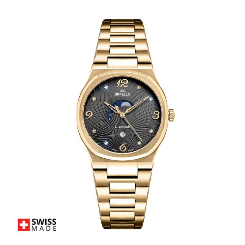 Дамски часовник Appella L32006.1176DQS е елегантен модел, който впечатлява с изтънчения си дизайн. Тъмносивият циферблат в комбинация със златистия корпус привличат вниманието, а диамантите добавят блясък. Моделът е с показател за дата и лунна фаза. Стъклото е сапфир-кристал с антирефлексно покритие. Верижката и корпусът са изработени от неръждаема стомана. Часовникът се задвижва от кварцов механизъм RONDA 788 Swiss Made. Диаметър на корпуса 33 мм. Водоустойчивост 5 ATM - допускат се леки пръски и взимане на душ, не се препоръчва обилно мокрене.