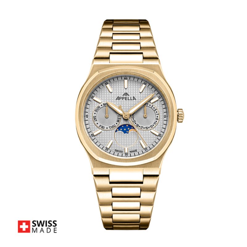 Дамски часовник Appella L32006.1117QF със спортно-елегантен дизайн. Мултифункционален дисплей с показатели за дата, ден от седмицата и лунна фаза. Луминисцентно покритие върху стрелките и индексите. Корпус и верижка изработени от неръждаема стомана. Стъкло сапфир-кристал с антирефлексно покритие. Задвижва се от кварцов механизъм RONDA 706 Swiss Made. Диаметър на корпуса 36.5 мм. Водоустойчивост 5 ATM - допускат се леки пръски и взимане на душ, не се препоръчва обилно мокрене.