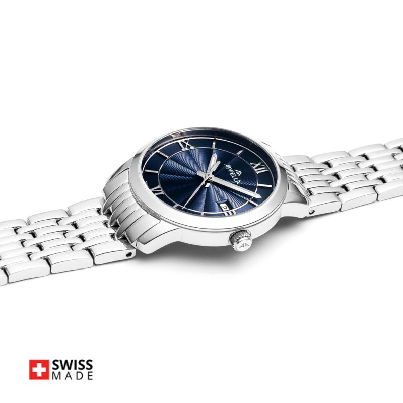 Дамски часовник Appella L32005.5165Q с корпус и верижка от неръждаема стомана. Аналогов дисплей с класически дизайн и индикатор за дата. Стъкло сапфир-кристал. Задвижва се от кварцов механизъм ETA F04 Swiss Made. Диаметър на корпуса 30 мм. Водоустойчивост 5 ATM - допускат се леки пръски и взимане на душ, не се препоръчва обилно мокрене.