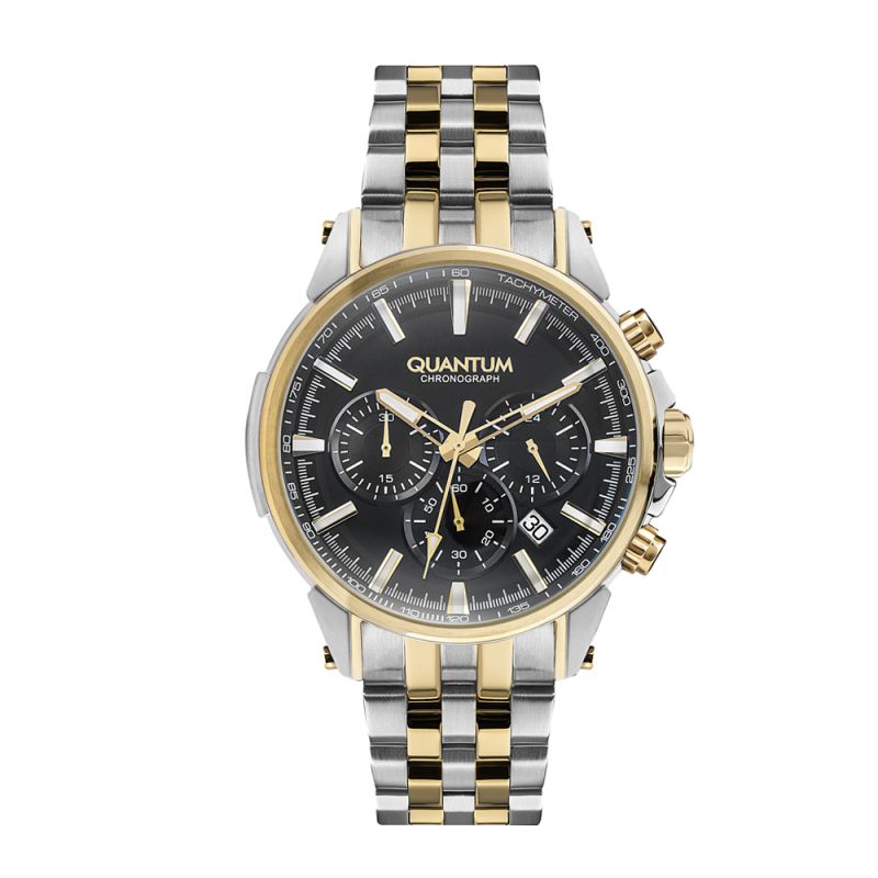 Мъжки часовник Quantum със спортно-елегантен дизайн от колекцията Powertech. Черен дисплей хронограф с детайли в цвят злато. Луминесцентно покритие на стрелките и индексите. Стъкло минерал-кристал. Корпус и верижка от неръждаема стомана. Часовникът се задвижва от кварцов механизъм с калибър VR32A15. Водоустойчивост 10 ATM - позволява мокрене, къпане и плуване във водни басейни.