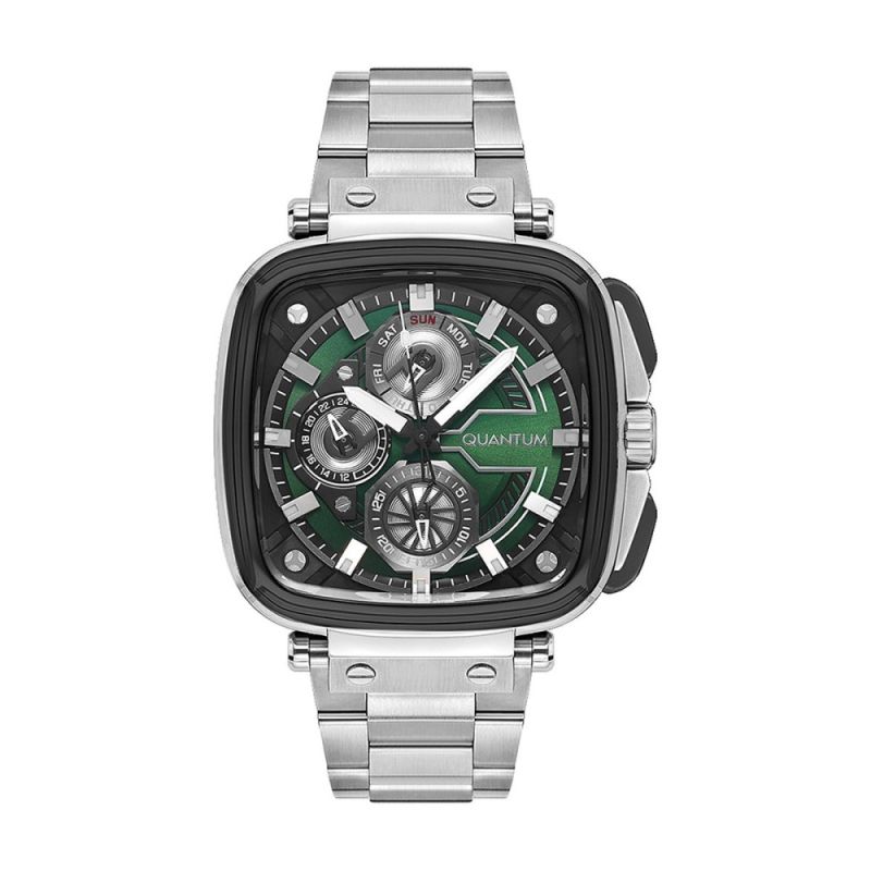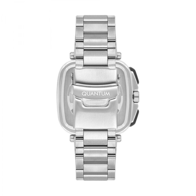 Спортно-елегантен мъжки часовник Quantum. Мултифункционален дисплeй с показатели за дата, ден от седмицата и 24-часов формат. Луминесцентно покритие на стрелките и индексите. Стъкло минерал-кристал. Корпус и верижка от неръждаема стомана. Кварцов механизъм. Водоустойчивост 10 ATM - позволява мокрене, къпане и плуване във водни басейни.