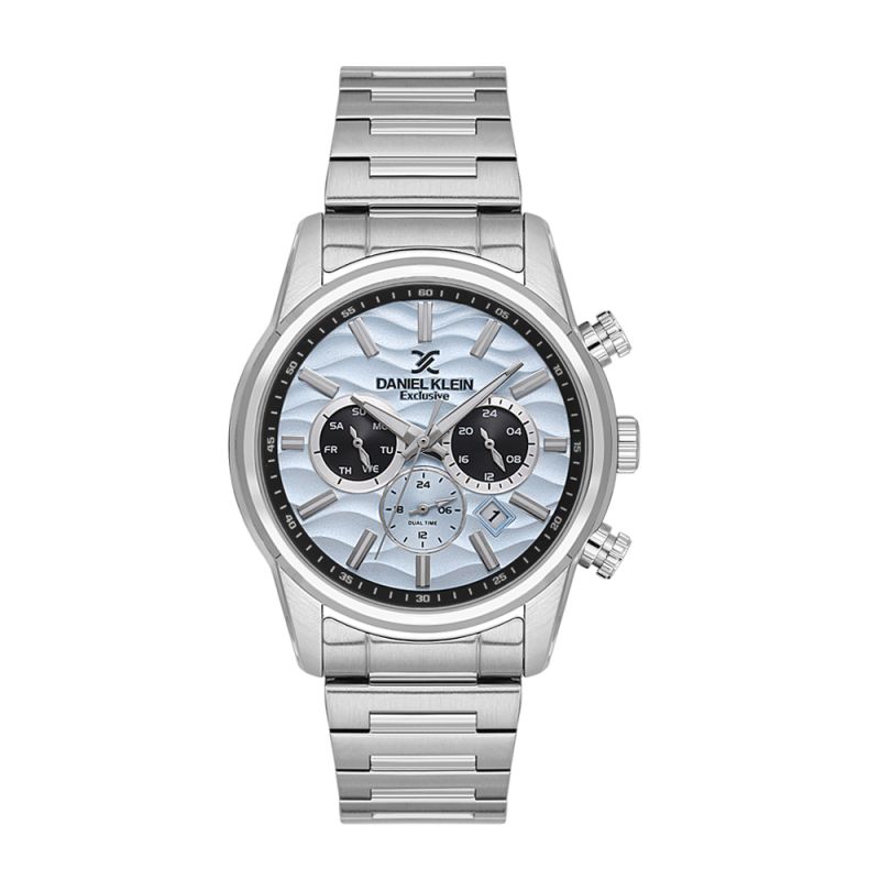 Мъжки часовник Daniel Klein със спортно-елегантен дизайн от колекцията Exclusive. Мултифункционален дисплей в светлосин цвят с интересна основа. Метален корпус. Диаметър на корпуса 51.5 мм. Сребриста верижка от неръждаема стомана. Стъкло минерал-кристал. Задвижва се от кварцов механизъм JP25-4.5. Водоустойчивост 5 ATM - допускат се леки пръски и взимане на душ, не се препоръчва обилно мокрене.