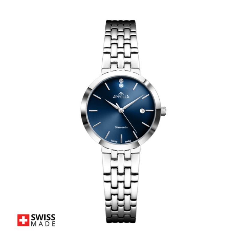 Дамски часовник Appella L50031.5115DQ с корпус и верижка от неръждаема стомана. Диаметър на корпуса 28 мм. Циферблат декориран с два диаманта и допълнен с показател за дата. Стъкло сапфир-кристал. Задвижва се от кварцов механизъм Ronda 785 Swiss Made. Водоустойчивост 3 ATM - допускат се леки пръски, не се препоръчва обилно мокрене.