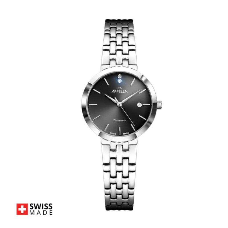 Дамски часовник Appella L50031.5114DQ с корпус и верижка от неръждаема стомана. Диаметър на корпуса 28 мм. Циферблат декориран с два диаманта и допълнен с показател за дата. Стъкло сапфир-кристал. Задвижва се от кварцов механизъм Ronda 785 Swiss Made. Водоустойчивост 3 ATM - допускат се леки пръски, не се препоръчва обилно мокрене.