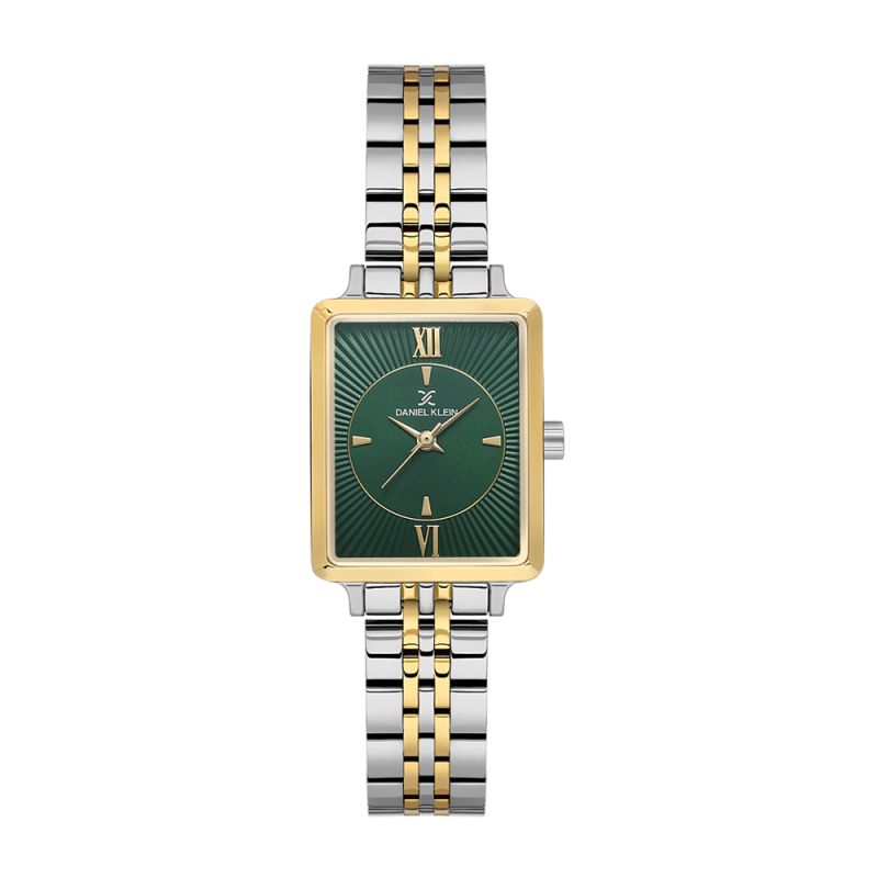 Дамски часовник Daniel Klein със стилен дизайн от колекцията Premium. Аналогов дисплей в зелен цвят със златисти детайли. Метален корпус в комбинация с верижка от неръждаема стомана. Стъкло минерал-кристал. Задвижва се от кварцов механизъм Y121F1. Водоустойчивост 3 ATM - допускат се леки пръски, не се препоръчва обилно мокрене.