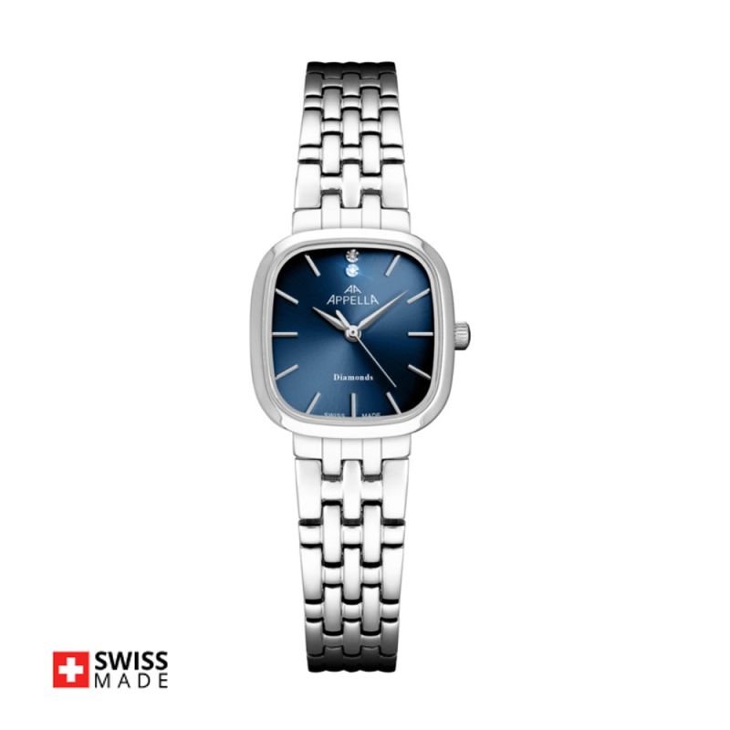 Дамски часовник Appella L50030.5115DQ с класически дизайн. Корпус и верижка изработени от неръждаема стомана. Стъкло сапфир-кристал. Циферблат в син цвят със сребристи детайли и два нежни диаманта. Задвижва се от кварцов механизъм Ronda 753 Swiss Made. Водоустойчивост 3 ATM - допускат се леки пръски, не се препоръчва обилно мокрене.