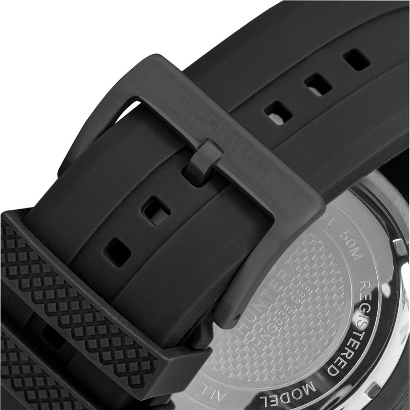 Страхотен модел мъжки часовник Quantum от колекцията Hunter. Дисплей комбинация от хронограф и скелетон с впечатляващ дизайн. Луминесцентно покритие върху стрелките и индексите. Стъкло минерал-кристал с антирефлексно покритие. Корпус от неръждаема стомана в комбинация със силиконова каишка. Часовникът се задвижва от кварцов механизъм с калибър VR33. Диаметър  на корпуса 51 мм. Водоустойчивост 10 ATM - позволява мокрене, къпане и плуване във водни басейни.