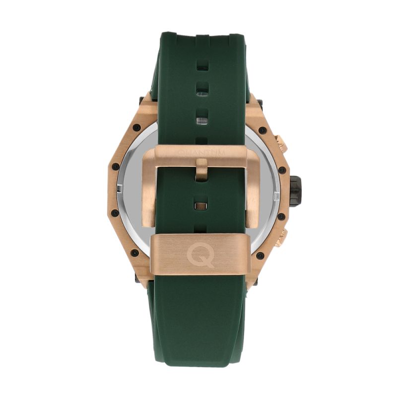 Мъжки часовник Quantum с интересен и модерен спортно-ежедневен дизайн от колекцията Hunter. Дисплей тип хронограф в зелен цвят с детайли в цвят розово злато. Луминесцентно покритие върху стрелките и индексите. Стъкло минерал-кристал с антирефлексно покритие. Корпус от неръждаема стомана. Зелена силиконова каишка. Задвижва се от кварцов механизъм с калибър VR34B14. Диаметър на корпуса 50 мм. Водоустойчивост 10 ATM - позволява мокрене, къпане и плуване във водни басейни.
