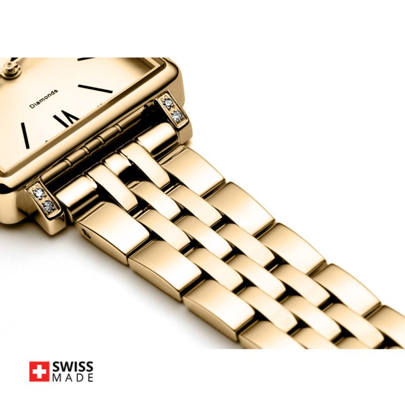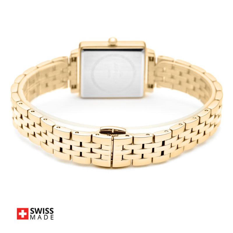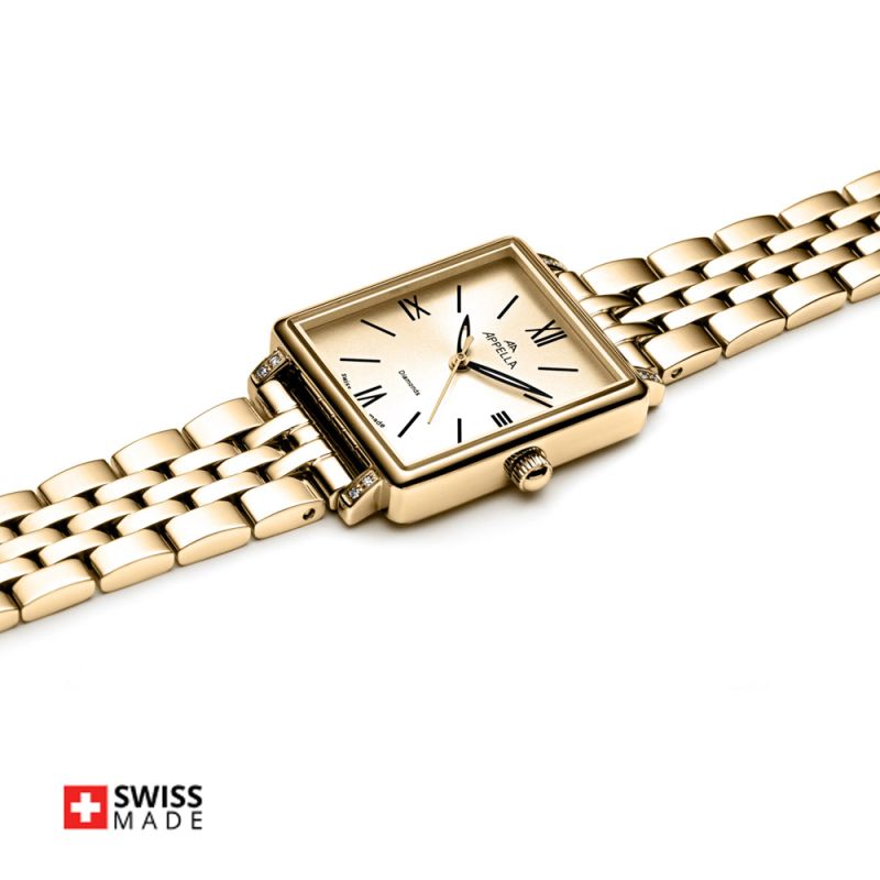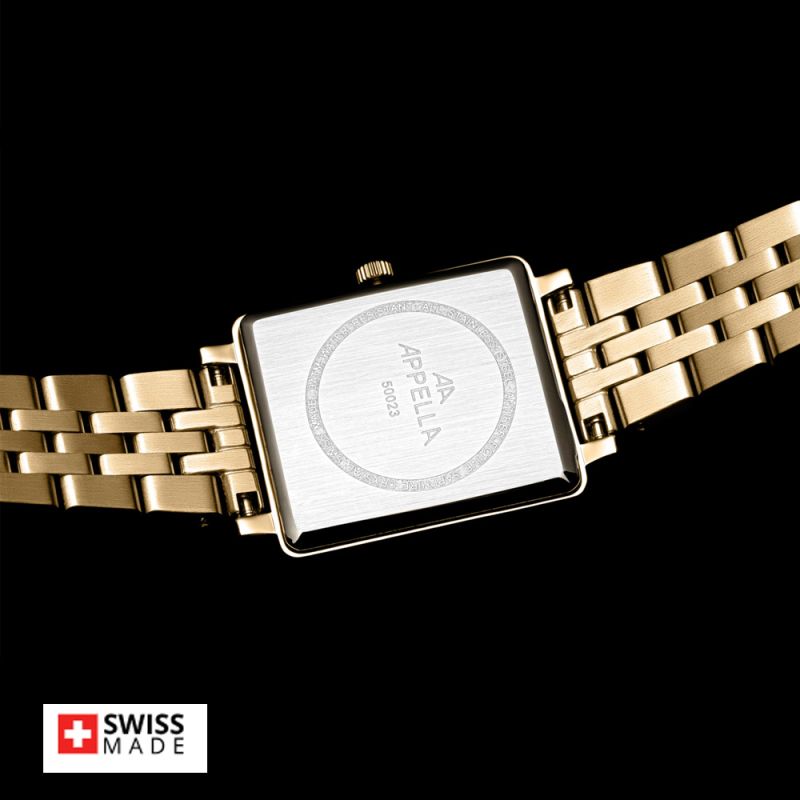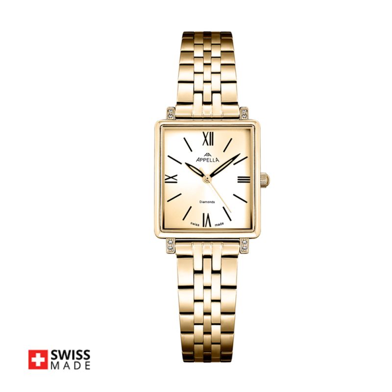 Дамски часовник Appella L50023.1161DQ привлича вниманието със своята елегантност. Корпусът и верижката са изработени от неръждаема стомана. Корпусът е украсен с осем диаманта. Моделът е с циферблат в златист цвят и стъкло сапфир-кристал с антирефлетсно покритие. Задвижва се от кварцов механизъм Eta F04/ Ronda 785 Swiss Made. Водоустойчивост 3 ATM - допускат се леки пръски, не се препоръчва обилно мокрене.
