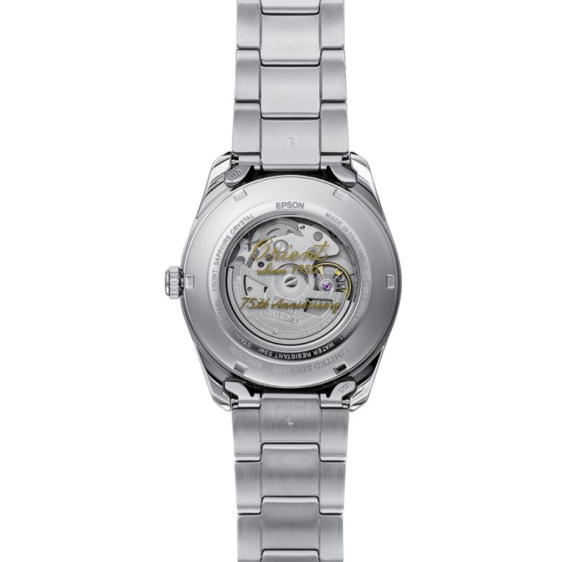 Лимитиран модел мъжки часовник Orient Stretto  със спортно-елегантен дизайн, послучай 75-тата годишнина на Orient. Аналогов дисплей с показател за дата, ден от седмицата и индикатор ден/нощ. Луминесцентно покритие  върху стрелките. Корпус и верижка изработени от неръждаема стомана. Стъкло сапфир-кристал. Часовникът е с автоматичен механизъм с възможност за ръчно навиване F6B24 със стабилната точност, варираща между +25 секунди до –15 секунди на ден, съчетана с 40-часов резерв на мощността, което го прави идеален за ежедневна употреба. Моделът е с  прозрачния гръб, с надпис "Orient Since 1950 75th Anniversary". Диаметър на корпуса 41.8 мм. Водоустойчивост 5 ATM - допускат се леки пръски и взимане на душ, не се препоръчва обилно мокрене.
