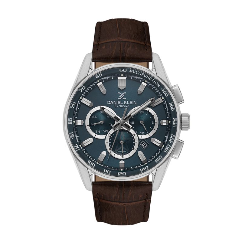 Мъжки часовник Daniel Klein с елегантен дизайн от колекцията Exclusive. Моделът е със син мултифункционален дисплей с показатели за дата, ден от седмицата и двойно време. Корпус изработен от метал. Тъмнокафява каишка от естествена кожа. Стъкло минерал-кристал. Диаметър на корпуса 44 мм. Часовникът се задвижва от кварцов механизъм JP25-4.5. Водоустойчивост 5 ATM - допускат се леки пръски и взимане на душ, не се препоръчва обилно мокрене.