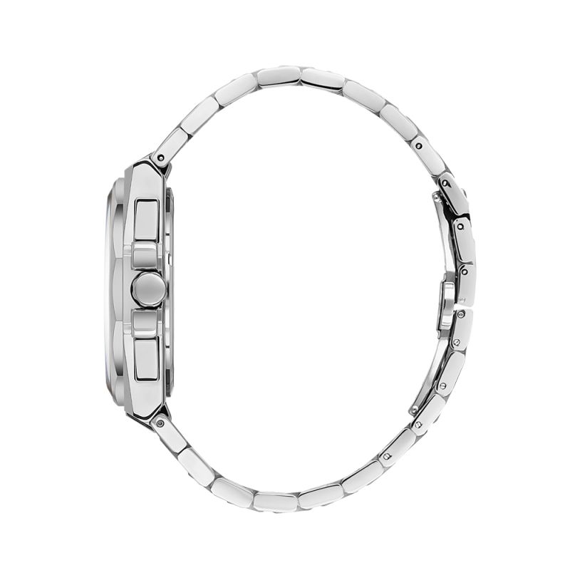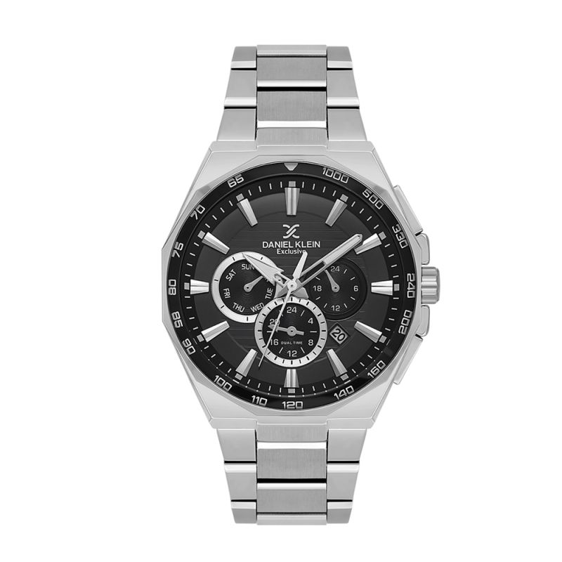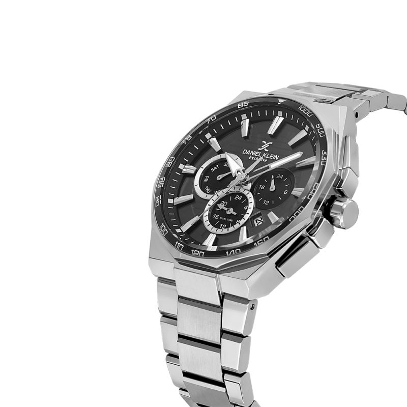 Мъжки часовник Daniel Klein със спортно-елегантен дизайн от колекцията Exclusive. Моделът е с метален корпус и верижка от неръждаема стомана. Диаметър на корпуса 44.5 мм. Мултифункционален дисплей с показатели за дата, ден от седмицата и двойно време. Стъкло минерал-кристал. Часовникът се задвижва от кварцов механизъм JP25-4.5. Водоустойчивост 5 ATM - допускат се леки пръски и взимане на душ, не се препоръчва обилно мокрене.