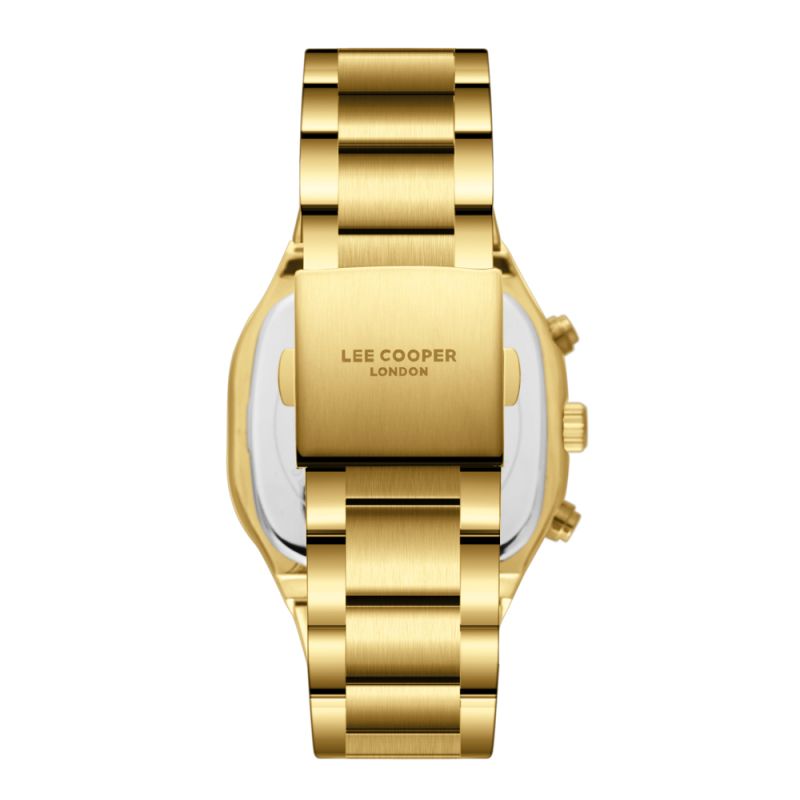 Впечатляващ модел мъжки часовник Lee Cooper със спортно-елегантен дизайн. Черен мултифункционален дисплей с показатели за дата, ден от седмицата, 24-часов формат и двойно време. Луминесцентно покритие върху стрелките и индексите. Стъкло минерал-кристал. Корпус от супер метал - специална сплав, създадена от марката. Верижка от неръждаема стомана в златист цвят. Задвижва се от кварцов механизъм. Водоустойчивост 5 ATM - допускат се леки пръски и взимане на душ, не се препоръчва обилно мокрене.
