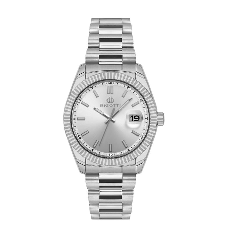 Мъжки часовник Bigotti с класически дизайн от колекцията Quotidiano. Моделът е с кропус от месинг и верижка от неръждаема стомана. Аналогов дисплей в сребрист цвят с показател за дата. Луминисцентно покритие върху стрелките и индексите. Стъкло минерал-кристал. Диаметър на корпуса 41 мм. Часовникът се задвижва от кварцов механизъм с калибър 2315-3. Водоустойчивост 5 ATM - допускат се леки пръски и взимане на душ, не се препоръчва обилно мокрене.