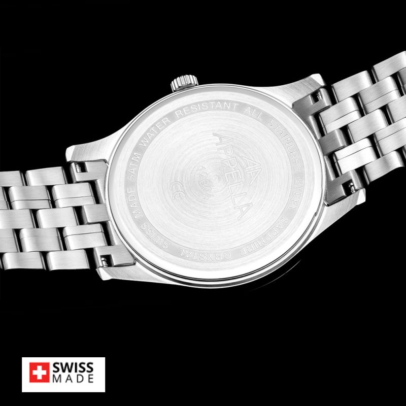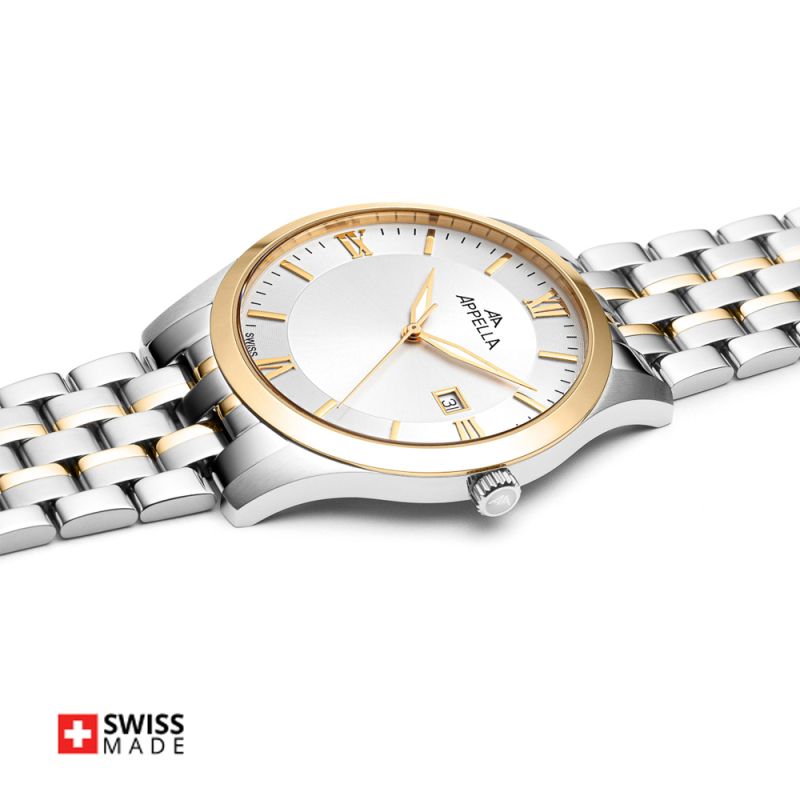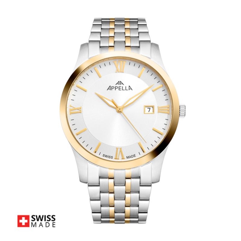 Стилен мъжки часовник Appella L12004.1167Q с корпус и верижка от неръждаема стомана. Сребрист циферблат със златисти детайли и показател за дата. Стрелките са с луминисцентно покритие. Стъклото е сапфир-кристал. Часовникът се задвижва от кварцов механизъм ETA F06 Swiss Made. Диаметър на корпуса 42 мм. Водоустойчивост 5 ATM - допускат се леки пръски и взимане на душ, не се препоръчва обилно мокрене.