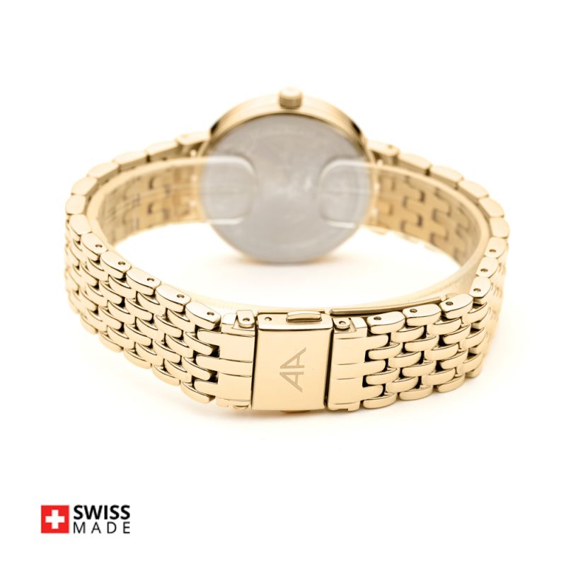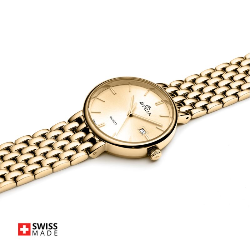 Appella L32007.1111Q е елегантен дамски часовник с корпус и верижка изработени от неръждаема стомана. Циферблат в златист цвят с индикатор за дата. Стъкло сапфир-кристал. Задвижва се от кварцов механизъм RONDA 785 Swiss Made. Диаметър на корпуса 30 мм. Водоустойчивост 3 ATM - допускат се леки пръски, не се препоръчва обилно мокрене.