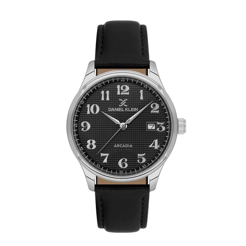 Класически модел мъжки часовник Daniel Klein със стилен дизайн от колекцията Arcadia. Дисплеят е аналогов с показател за дата. Корпусът е изработен от метал. Каишката е от естествена кожа. Стъклото е минерал-кристал. Часовникът се задвижва от кварцов механизъм VX42E11. Диаметър на корпуса 41 мм. Водоустойчивост 5 ATM - допускат се леки пръски и взимане на душ, не се препоръчва обилно мокрене.