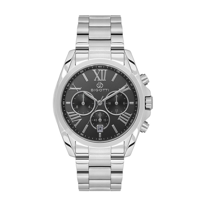 Мъжки часовник Bigotti със спортно-елегантен дизайн от колекцията Raffinato. Черен мултифункционален дисплей със сребристи детайли и римски цифри. Стъкло минерал-кристал. Диаметър на корпуса 42.8 мм. Корпус изработен от месинг. Верижка от неръждаема стомана. Часовникът се задвижва от кварцов механизъм. Водоустойчивост 5 ATM - допускат се леки пръски и взимане на душ, не се препоръчва обилно мокрене.