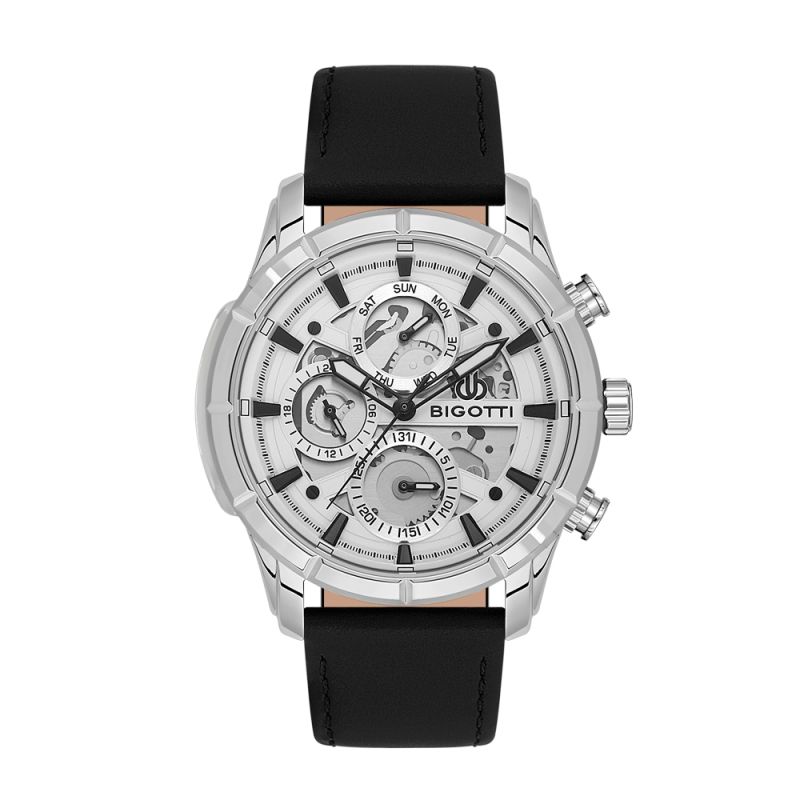 Впечатляващ мъжки часовник Bigotti със стилен дизайн от колекцията Raffinato. Дисплей комбинация между мултифункционален и скелетон с показатели за дата, ден от седмицата и 24-часов формат. Луминесцентно покритие върху стрелките. Стъкло минерал-кристал. Моделът е с корпус от месинг и каишка от естествена кожа. Диаметър на корпуса 44 мм. Часовникът се задвижва от кварцов механизъм. Водоустойчивост 5 ATM - допускат се леки пръски и взимане на душ, не се препоръчва обилно мокрене.