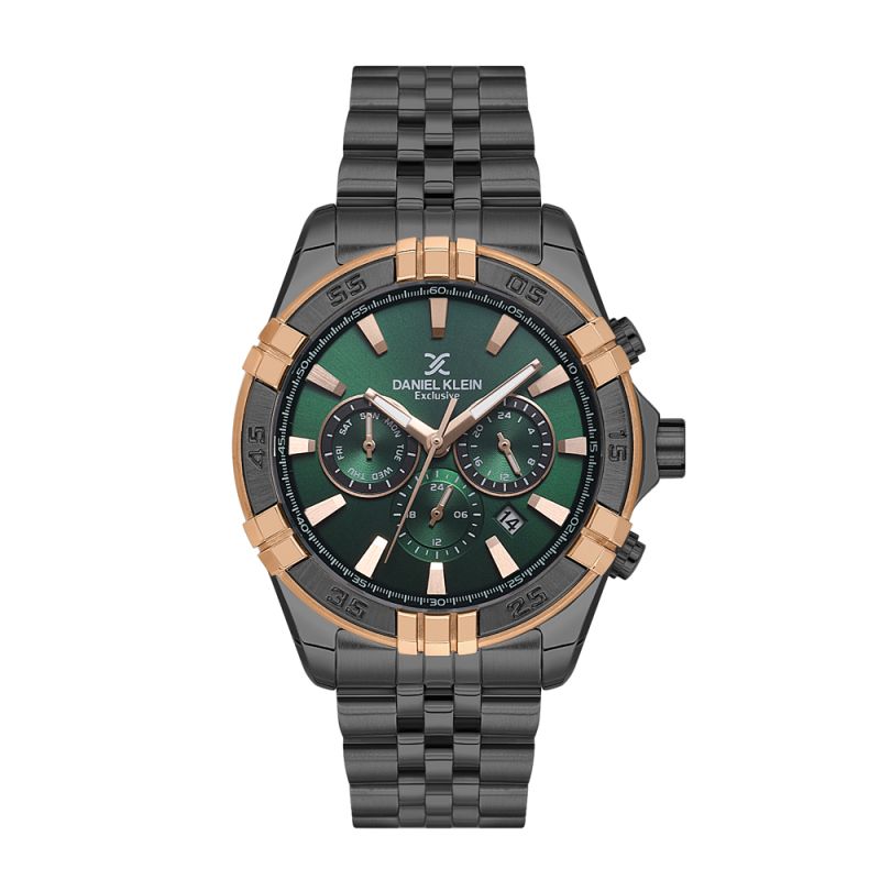 Впечатляващ мъжки часовник Daniel Klein с мултифункционален дисплей от колекцията Exclusive. Моделът е с метален корпус и верижка от неръждаема стомана. Стъкло минерал-кристал. Диаметър на корпуса 44 мм. Часовникът се задвижва от кварцов механизъм JP25-4.5. Водоустойчивост 5 ATM - допускат се леки пръски и взимане на душ, не се препоръчва обилно мокрене.