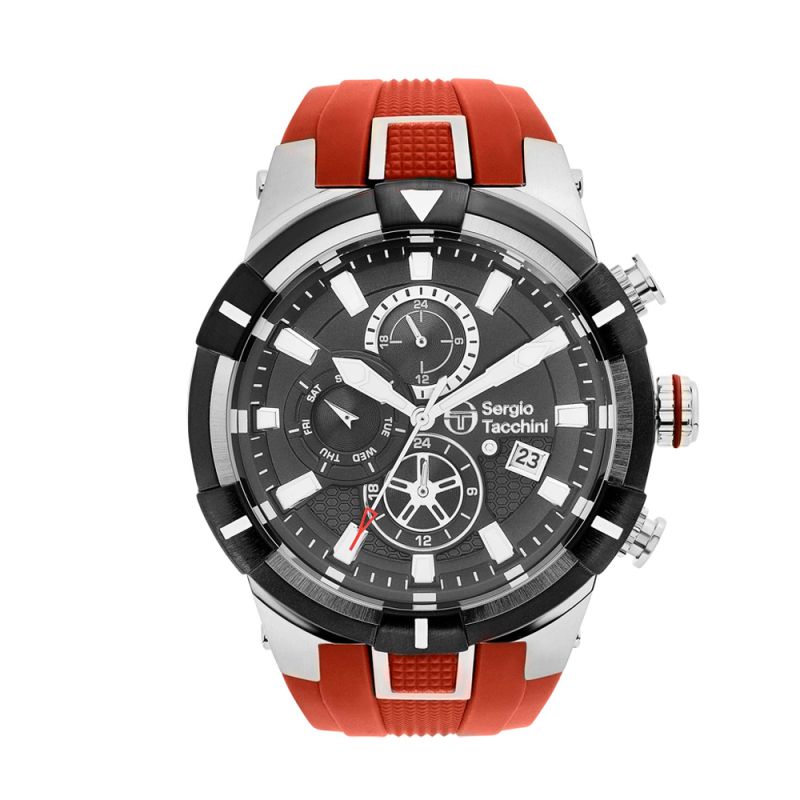 Мъжки часовник Sergio Tacchini с модерна спортна визия от колекцията Heritech. Моделът е с кръгъл стоманен корпус и силиконова каишка. Черен мултифункционален дисплей със сребристи детайли. Луминесцентно покритие на стрелките и индексите. Стъкло минерал-кристал. Диаметър на корпуса 45 мм. Часовникът се задвижва от кварцов механизъм. Водоустойчивост 5 ATM - допускат се леки пръски и взимане на душ, не се препоръчва обилно мокрене.