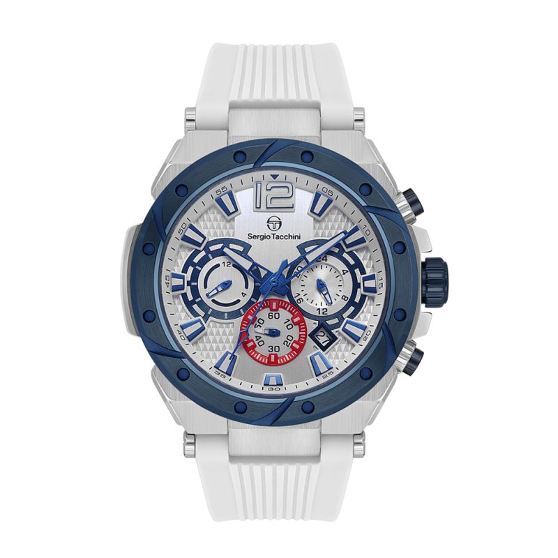 Страхотен модел мъжки часовник Sergio Tacchini със спортна визия от колекцията Heritech. Корпус от неръждаема стомана съчетан със силиконова каишка. Мултифункционален дисплей с впечатляващ дизайн. Луминесцентно покритие върху стрелките и индексите. Стъкло минерал-кристал. Диаметър на корпуса 46 мм.Часовникът се задвижва от кварцов механизъм. Водоустойчивост 10 ATM - позволява мокрене, къпане и плуване във водни басейни.