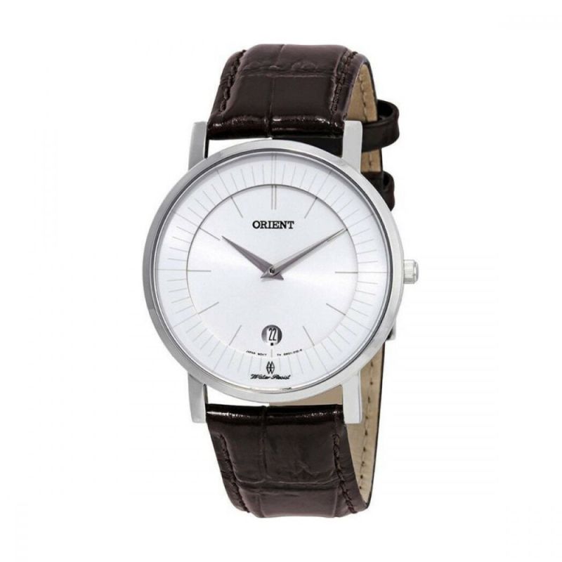 Класически модел мъжки часовник Orient с елегентен дизайн от колекцията Classic. Корпус от неръждаема стомана, съчетан с кафява каишка от естествена кожа. Бял аналогов дисплей с показател за дата и сребристи детайли. Стъкло сапфир-кристал. Задвижва се от кварцов механизъм. Водоустойчивост 5 ATM - допускат се леки пръски и взимане на душ, не се препоръчва обилно мокрене.